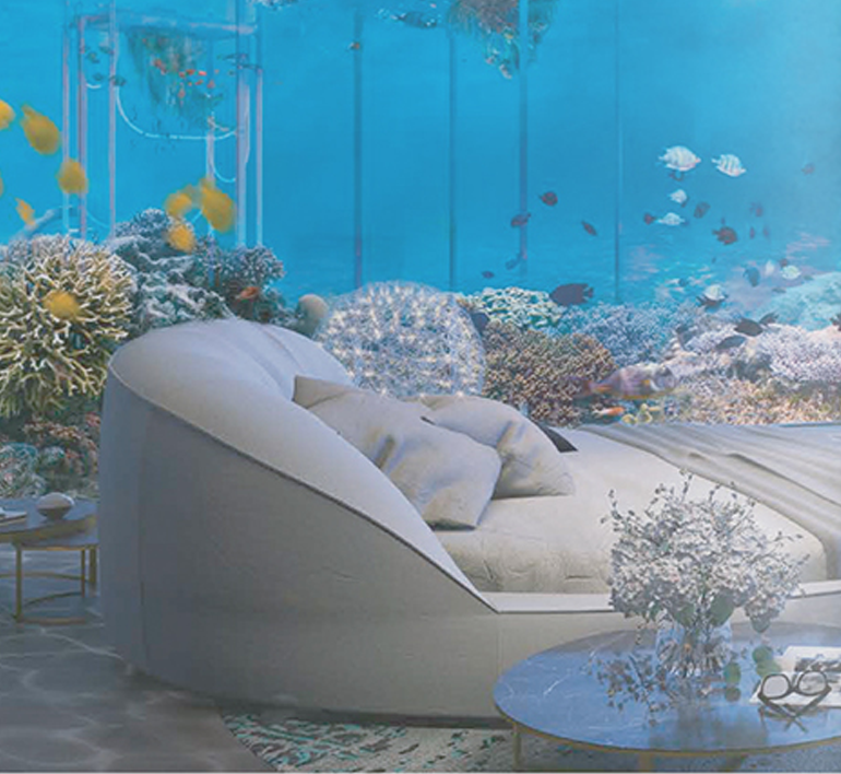 First luxury underwater vessel resort, offering both five-star accommodation and dining experiences above and below the water remarkable views of passing gondolas above and coral reefs teaming with life below